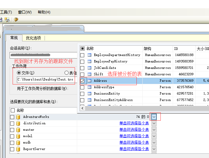 在选择要优化的数据库和表中,我们单独找到需要被分析的表Address