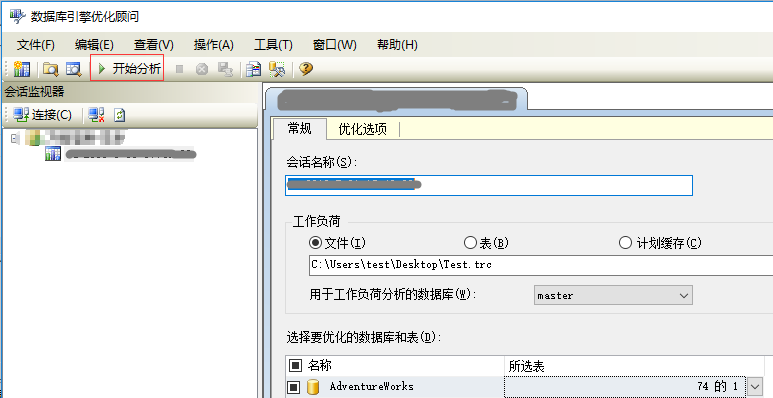 点击SQL Server Profiler菜单栏中的【工具】——>【数据库引擎优化顾问】开始对刚才的Test.trc文件进行分析,如图11: