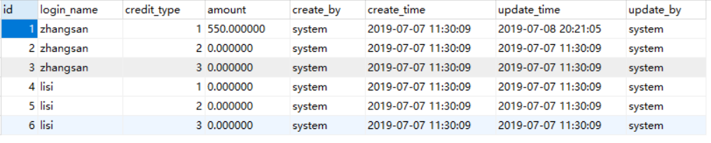 INSERT INTO `t_customer_credit` VALUES (6, 'lisi', 3, 0.000000, 'system', '2019-7-7 11:30:09', '2019-7-7 11:30:09', 'system');