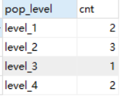 level_1:population < 20,level_2:20 <= population < 50 ,level_3:50 <= population < 70 ,level_4:>= 70;统计出 level_1 ~ level_4 的数量各有多少