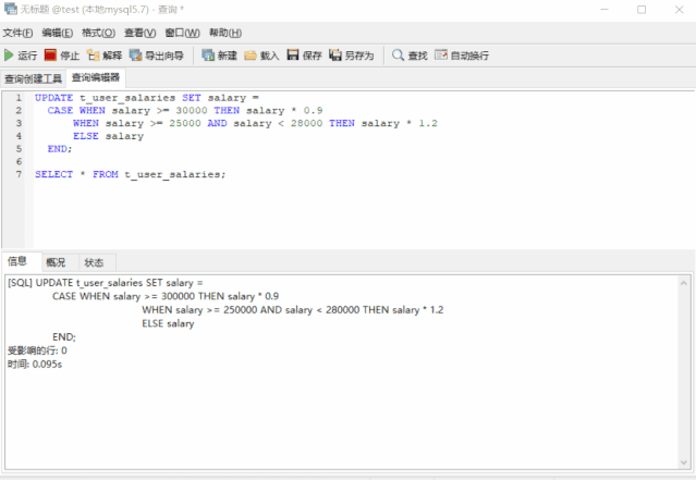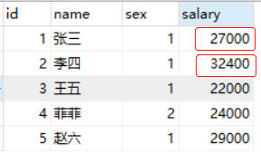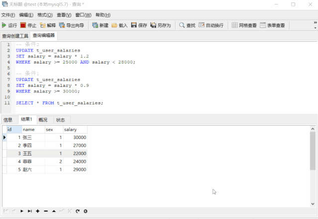 我们发现张三的薪资不降反升了!这是因为执行 条件1的SQL后,张三的薪资又满足条件2了,所以又更新了一遍,导致他的薪资变多了,有人可能会说,把条件1和条件2的SQL换下顺序不就好了吗,我们来试试