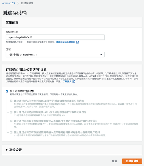 因为 S3 存储桶的名字是 DNS 的一部分,要起一个独一无二的名字,然后选择区域,创建存储桶。阻止所有公有访问权限选项默认是选中的,强烈建议不要改这个地方,否则数据有被他人访问的风险。