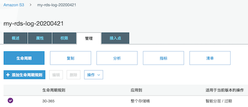 https://docs.aws.amazon.com/zh_cn/AmazonS3/latest/dev/object-lifecycle-mgmt.html2.RDS MySQL 日志文件: