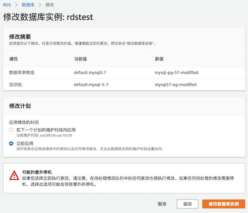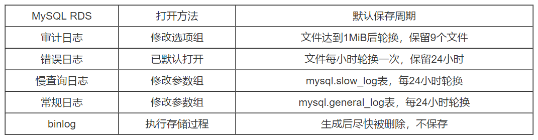 MySQL 有错误日志、慢查询日志、常规日志、审计日志和 Binlog。错误日志是默认打开的,慢查询日志和审计日志需要修改参数组才能打开,审计日志需要修改选项组才能打开。Binlog 默认不保存。注意:更换选项组或修改审计选项不会造成 RDS 重启,但可能造成连接中断。默认:保留9个审计文件,每个文件大小1MiB。请根据业务情况修改。例:100个文件,每个100MiB(占10GiB)。SERVER_AUDIT_FILE_ROTATIONS: 100SERVER_AUDIT_FILE_ROTATE_SIZE: 100000000https://docs.aws.amazon.com/zh_cn/AmazonRDS/latest/UserGuide/Appendix.MySQL.Options.AuditPlugin.html