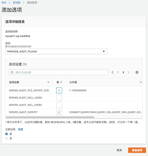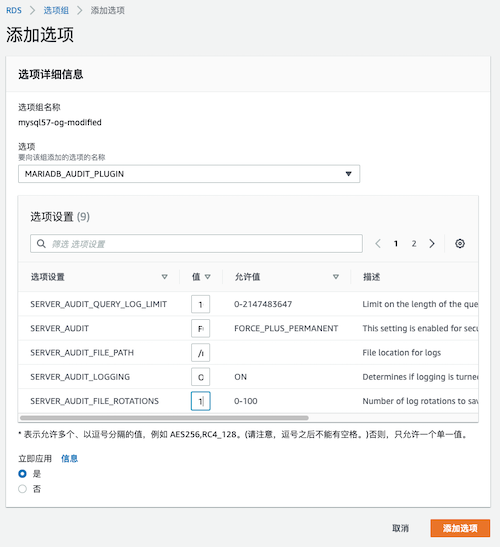 https://docs.aws.amazon.com/zh_cn/AmazonRDS/latest/UserGuide/Appendix.MySQL.Options.AuditPlugin.htmlhttps://docs.aws.amazon.com/zh_cn/AmazonRDS/latest/UserGuide/USER_ModifyInstance.MySQL.html#USER_ModifyInstance.MySQL.Settings