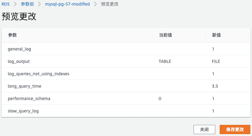 注意:更换参数组需要重启 RDS,更改参数组中的参数可能需要重启 RDS。开启常规日志和慢查询日志会影响 DB 的性能,尤其是 DB 负载很高查询很多的时候。因此请根据情况选择是否打开。修改参数的影响请参考下面的链接:https://docs.aws.amazon.com/zh_cn/AmazonRDS/latest/UserGuide/USER_ModifyInstance.MySQL.html#USER_ModifyInstance.MySQL.Settings存储日志到文件:log_output = FILE开启慢查询日志:slow_query_log = 1long_query_time = 3.5(记录超过3.5秒的查询)log_queries_not_using_indexes = 1 (记录未使用索引的查询)开启 performance_schema:performance_schema = 1RDS 参数组没有默认打开 performance_schema,建议打开。