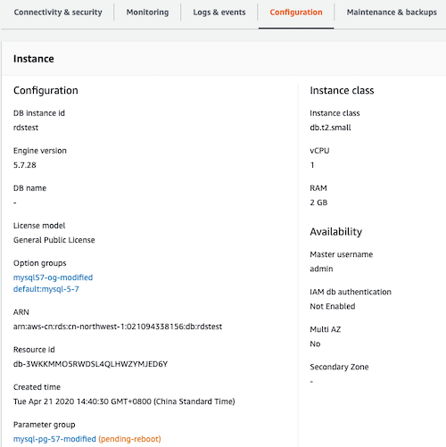 RDS 的 Configuration 页面是 pending-reboot 状态,RDS 重启后变成 in-sync 状态,设置生效。通过 Lambda 转储 RDS 日志