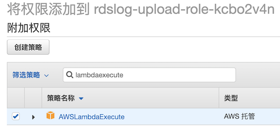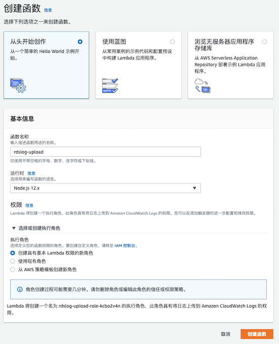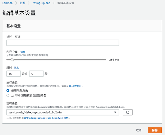 2)Lambda 代码最多运行15分钟,处理能力与分配的内存大小有关。建议分配 256MiB 以上的内存并指定15分钟的超时时间。如果 RDS 在业务繁忙时间生成的日志量太大,Lambda 不能在15分钟内处理完所有日志,就需要分配更大的内存。3)Lambda 的临时路径 /tmp 的容量是512MiB,以20%的压缩比率计算,能处理最大 2.5GiB 的单个日志。4)Lambda 除了基本的执行权限以外,还需要内联策略下载 RDS 日志,附加 AWSLambdaExecute 权限上传到 S3。<bucket>–RDS–<rds_id>–<log_type>–<YYYY-MM-DD>创建 Lambda 的步骤