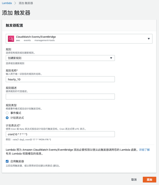 这个步骤将创建一个拥有基本的 Lambda 执行权限的角色。后面第4)步中再给它添加 RDS 和 S3 的访问权限。2)配置一个 CloudWatch Events,每小时的第10分钟自动执行 Lambda Schedule 可以用 Crontab 格式:cron(10 * ? * * *)下面的代码里面,rdsid、bucket、region 三个变量需要根据实际情况修改。