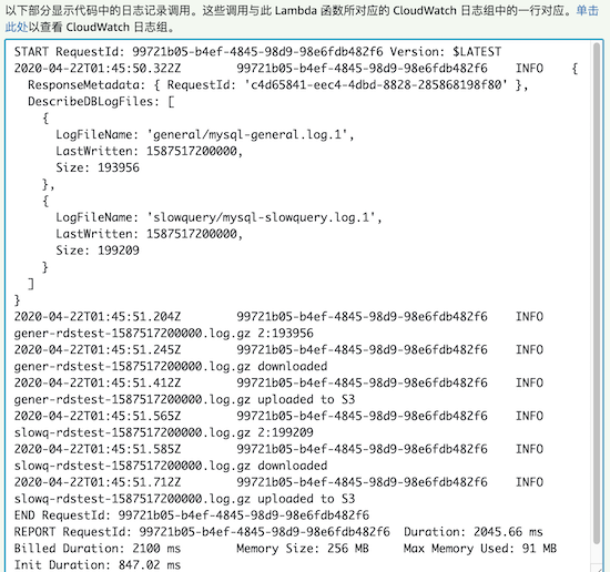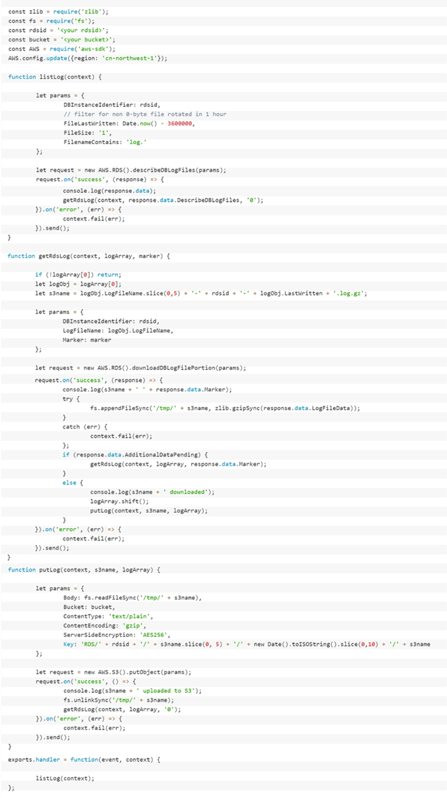 1)这段代码利用 API 获得 RDS 的日志状态。其中 describeDBLogFiles 获得1小时内新生成的日志一览后依次处理各个日志。downloadDBLogFilePortion 下载日志并压缩后存储到 Lambda的/tmp 临时路径,putObject 上传日志文件到 S3 存储桶。