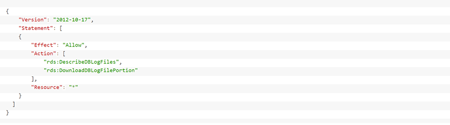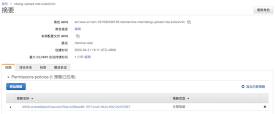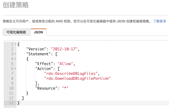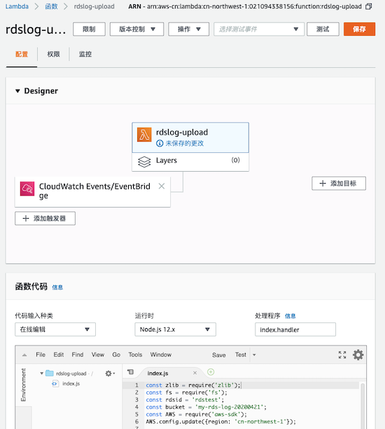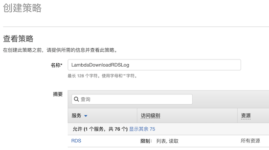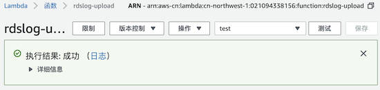 粘贴和修改完代码以后,要点击一下画面右上角的保存按钮。权限设置,点击下方查看…角色的链接,为 RDS 和 S3 的相关操作附加策略。权限设置完成后再点保存。在 JSON 窗口粘贴以下内容,创建一个名为 LambdaDownloadRDSLog 的策略这个 Lambda 函数是定时驱动的,不需要传入参数。点击测试按钮后用默认事件模版创建一个测试事件,然后再测试。执行结果的详细信息里面,会列出 describeDBLogFiles 获得的1小时内新生成的日志一览,downloadDBLogFilePortion 分页下载日志的结果,putObject 上传日志文件到 S3 存储桶的结果。Lambda 函数测试通过以后,就可以保存下来。这个函数会被刚才配置的 CloudWatch 事件定期触发,自动转储日志到 S3 存储桶。参考链接