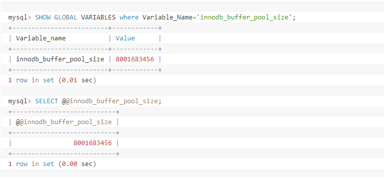 如果要查询实例使用的实际值,有两种方法可以在命令行上执行此操作。通过使用SHOW GLOBAL VARIABLES或SELECT语句: