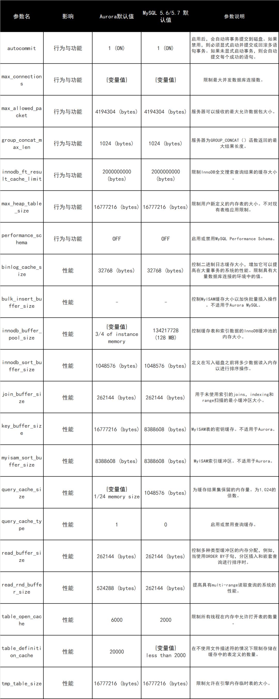 本文还将分析其中的一些参数和它们的默认值,以及它们在修改时如何影响实例的行为或性能。下表描述了在参数组中找到的参数名称,Aurora和MySQL默认值,以及通过修改此参数而影响的功能的摘要。
