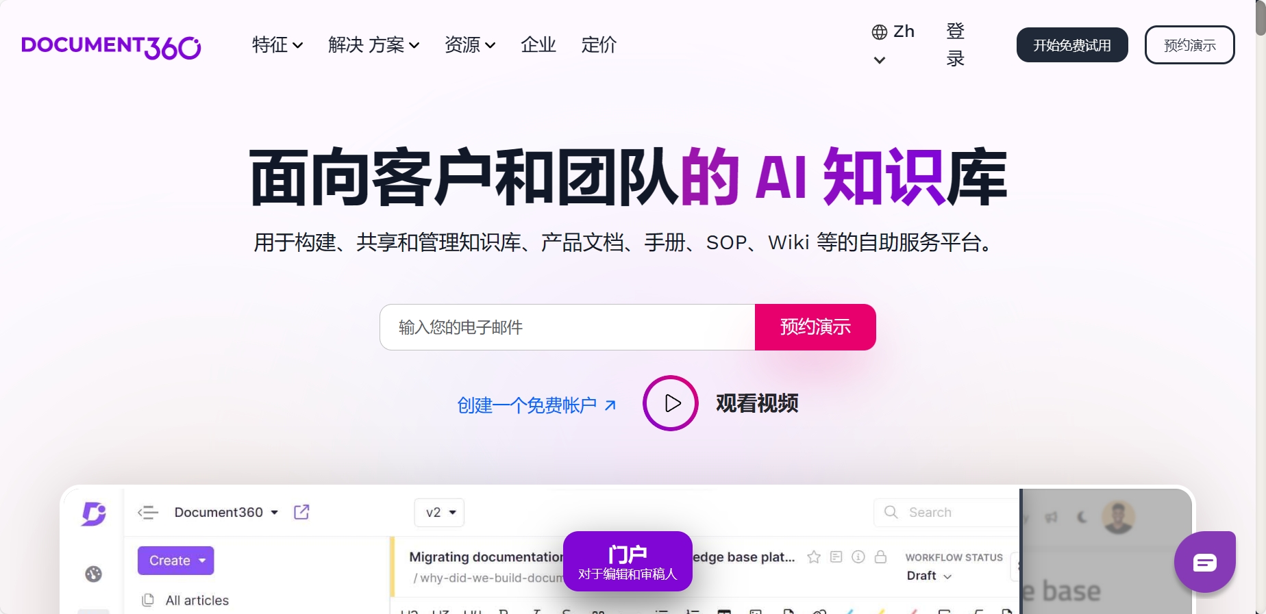 第五个是Document360。它是一个集文档存储、共享、编辑和讨论于一身的团队协作和知识管理平台。