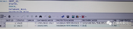 | select DEST_ID,STATUS,ERROR,DATABASE_MODE,PROTECTION_MODE,RECOVERY_MODE,SRL,GAP_STATUS from v$archive_dest_status where status<>'INACTIVE'; |