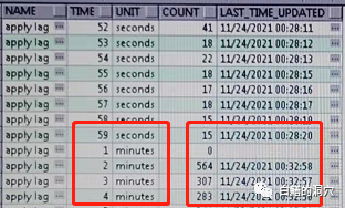 可以看出,备库确实是实时恢复状态,第一个疑问排除了。第二步就是确认LAG确实和客户说的那样,有时候客户会做出一些错误的描述,从而导致分析方向的错误,大家分析了半天,最后发现问题的描述不对,最后分析了个寂寞。在Oracle数据库中V$STANDBY_EVENT_HISTOGRAM记录了APPLY LAG相关的所有事件。