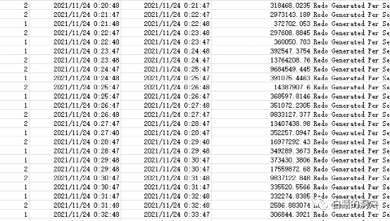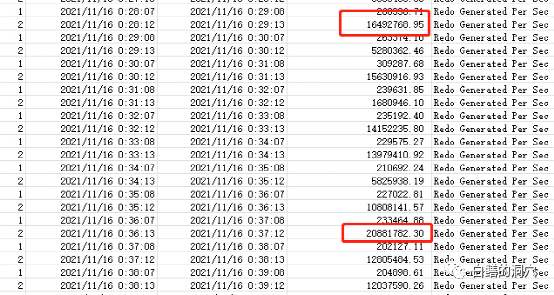 确实从数据上看,似乎16号的REDO产生量更大,最高都达到20M/秒了。不过这个数据看上去并不一定准确,因为REDO是持续产生的,只看高峰不一定准确,我们选取一些数据,计算一下平均REDO量,才能真正看出每个高峰期的REDO总量。