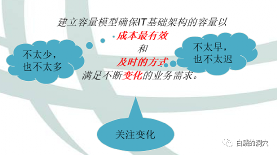 用一句话来概括容量管理的核心就是“建立容量模型,确保IT基础设施的容量以成本最有效和及时的方式满足不断变化的业务的需求”。这么的核心词是“成本最有效”,“及时的方式”,去满足“变化”的需求。从容量模型建设上看,我们必须从三个层次来考虑容量。