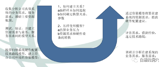 作为容量管理的依据是业务容量,企业的业务发展蓝图,业务增长计划等都是作为企业IT容量管理的基础,如果IT容量管理不考虑企业的业务发展规划,那么这个容量管理顶多也就是拍脑袋的产物。不过企业业务容量不能马上转化为服务器的数量以及存储的容量,首先要转化为服务容量。每个企业的IT系统的技术架构不同,开发商水平参差不齐,采用的应用架构也不同,因此业务容量首先要进行一次转换,转换为服务容量。通过服务容量,再进一步分解出可量化的因子,从而推导出资源容量。在实际工作中,我们可以采取下图的方法来完成容量模型的构建工作。