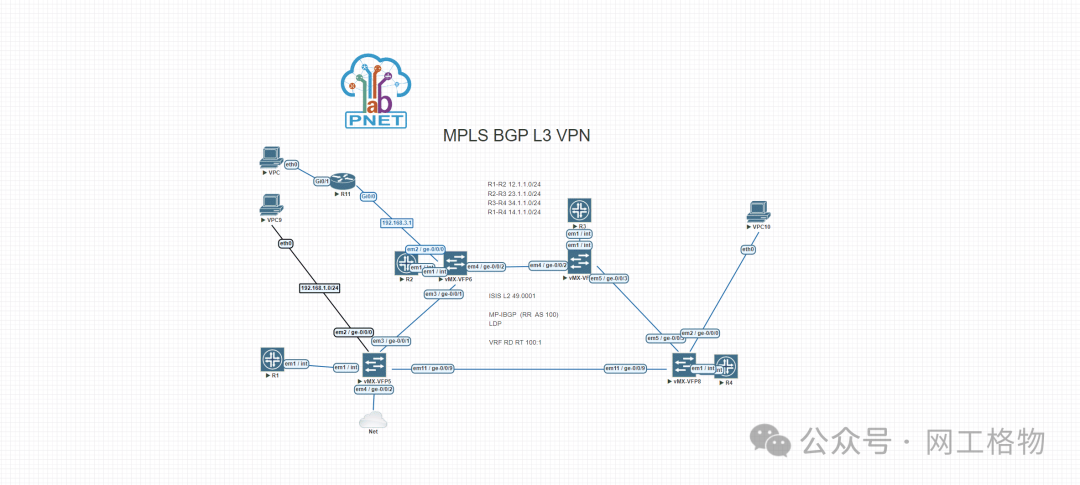 ISIS L2 作为 IGP打通底层路由,LDP 作为公网MPLS标签分发,PE之间使用MP-IBGP