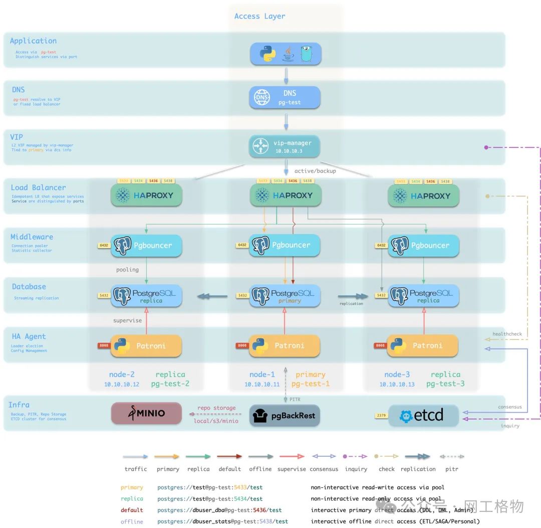 软件故障、人为错误和 数据中心级灾难由 pgbackrest 和可选的 MinIO 集群来兜底。这为您提供了本地/云端的 PITR 能力,并在数据中心爆炸的情况下提供了跨地理区域复制,与异地容灾功能。