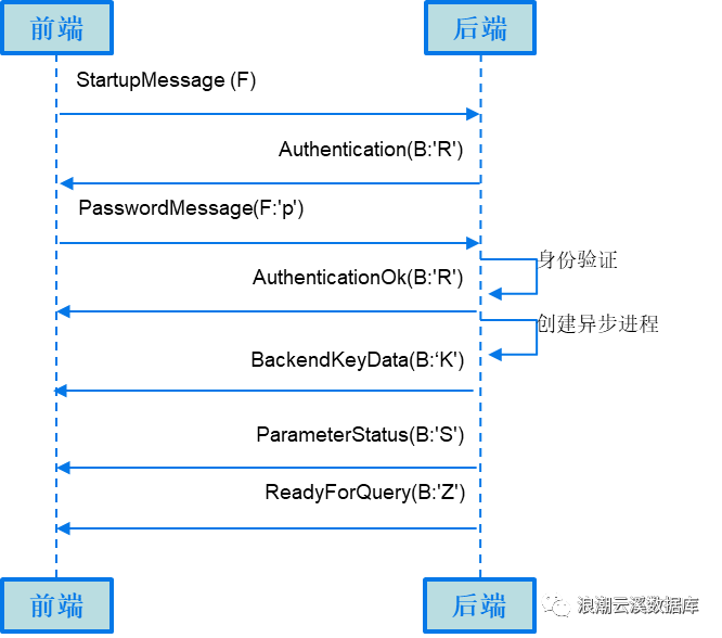 完成身份验证之后,前端需要等待服务器发送进一步的消息,此时服务器会启动一个异步进程(线程或协程)为当前客户端提供数据库服务(在此期间,服务器会尝试用客户端在启动消息中指定的额外运行时参数配置数据库,如果成功这些值将成为当前会话的缺省配置,配置失败则发送ErrorResponse报文并退出),正常情况下服务器之后会陆续发送ParameterStatus、BackendKeyData以及ReadyForQuery报文用于通知客户端可以接收查询指令。