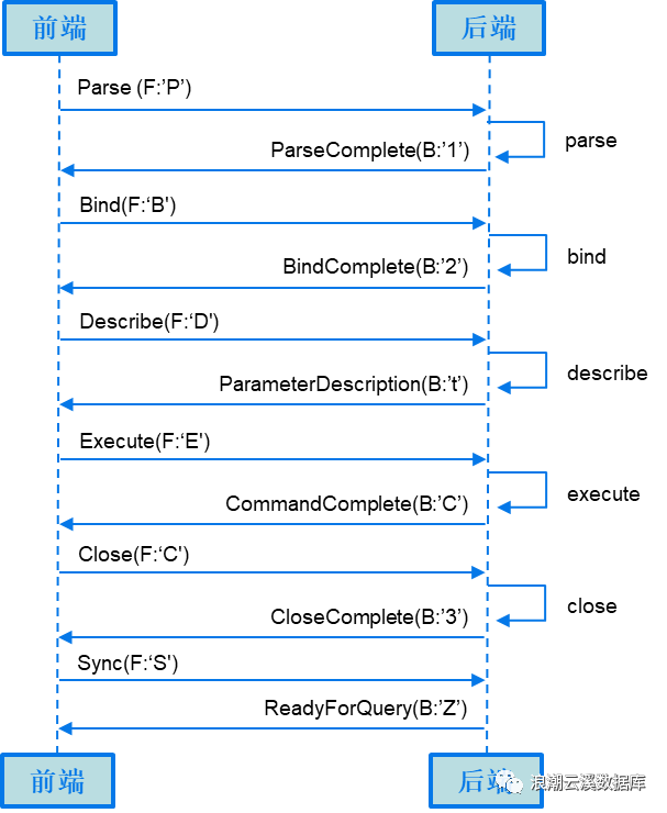 在扩展查询协议中,客户端首先发送一个Parse消息,它包含一个文本查询字符串,另外还有一些可选的有关参数占位符的数据类型的信息,以及一个最终的预备语句对象的名字。服务器响应是一个ParseComplete或者ErrorResponse消息。参数的数据类型可以用OID来指定;如果没有给出,那么分析器将试图用应付无类型文字符串常量的方法来推导其数据类型。