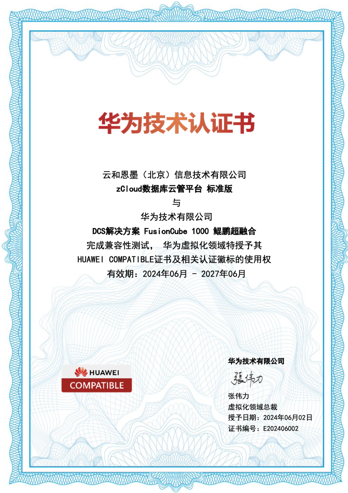 近日,云和恩墨(北京)信息技术有限公司(以下简称:云和恩墨)与华为技术有限公司(以下简称:华为)完成云和恩墨数据库云管平台 zCloud 与华为DCS解决方案FusionCube 1000鲲鹏超融合的产品兼容互认证。