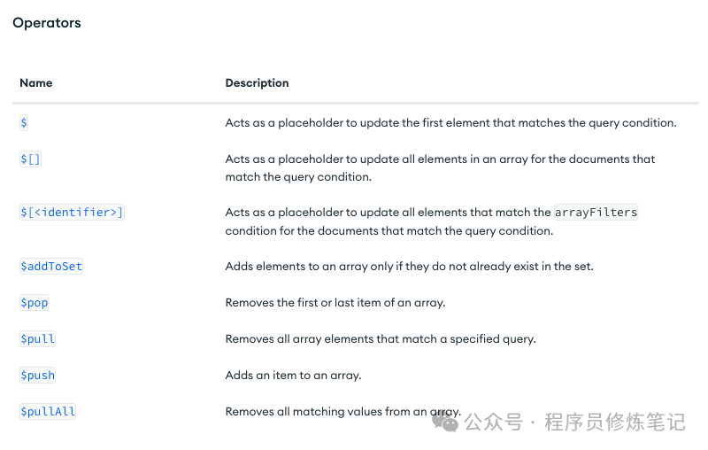 为了更新Document,MongoDB提供了一批operators,如下: