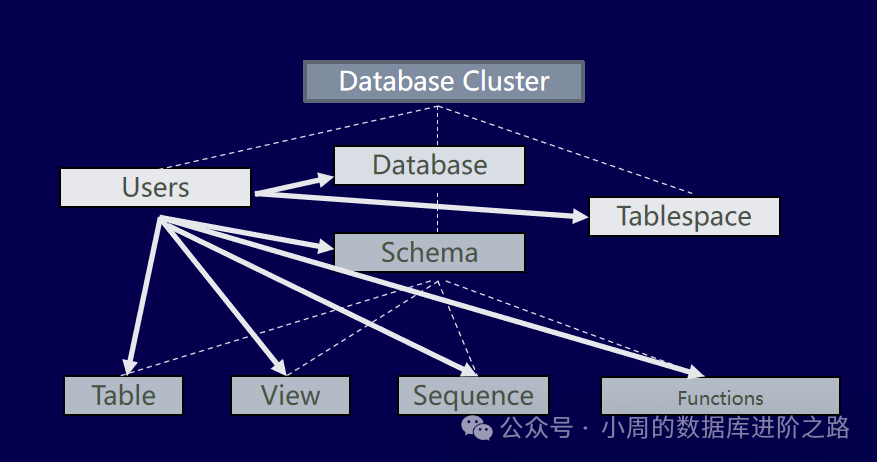 数据库是一个模式的集合, 而模式包含表、函数等数据库对象