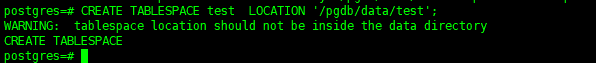 postgres=# CREATE TABLESPACE test LOCATION '/pgdb/data/test';