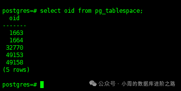 select oid from pg_tablespace; #获取表空间的oid信息