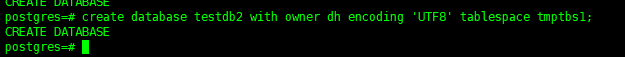 create database testdb2 with owner dh encoding ‘UTF8’ tablespace tmptbs1;
