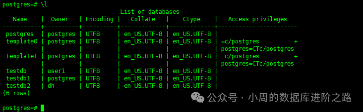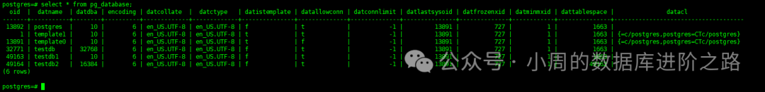 select * from pg_database; 或者 \l