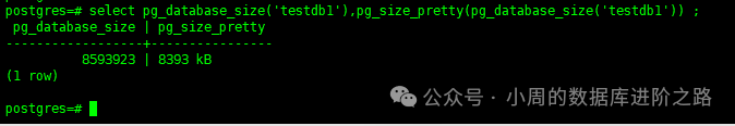 select pg_database_size(‘testdb1’),pg_size_pretty(pg_database_size(‘testdb1’)) ;