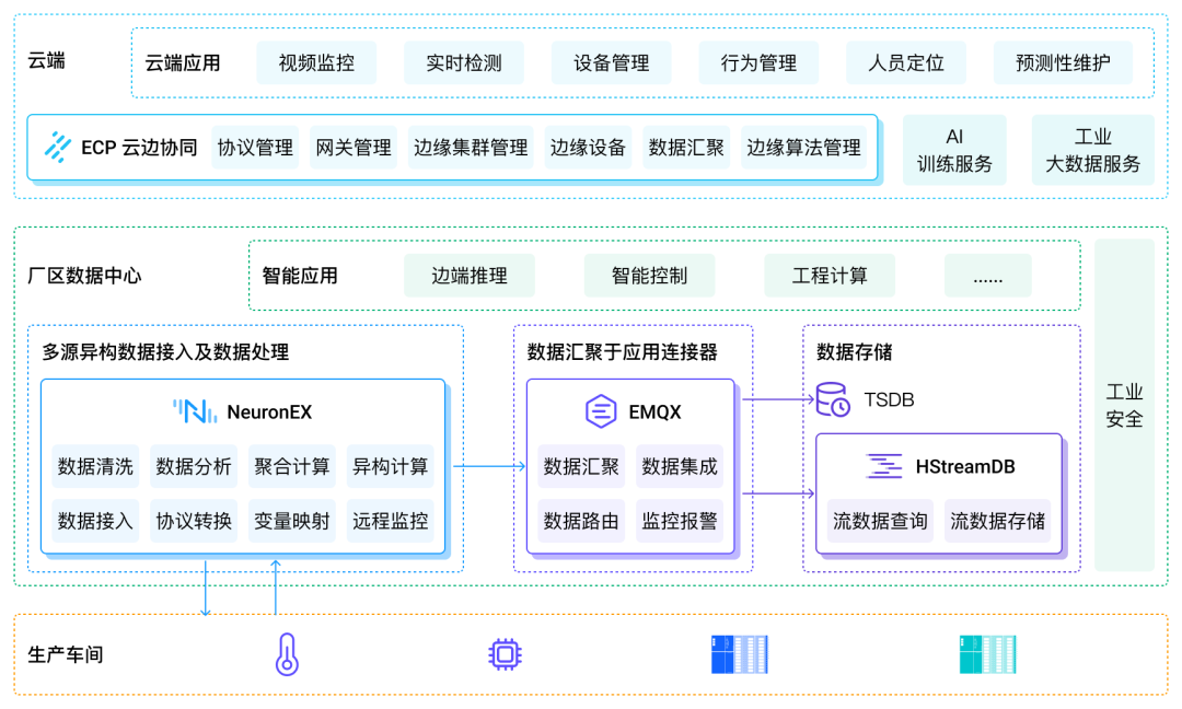 通过在边缘侧部署工业边缘网关软件 NeuronEX,方案能够实时采集设备状态、生产过程等关键数据,分别写入边缘侧的时序数据库与对象存储中,以供边端应用使用。同时,边缘侧的数据也以统一的 MQTT 协议上报至云端。NeuronEX 支持 100 多种常见的工业协议数据接入能力,帮助化工行业智能服务平台支持多种标准化的通信方式,以便与不同的设备进行数据交换。同时,NeuronEX 还具备边缘流式计算能力,对实时数据流进行基于规则的过滤和处理,并将处理结果推送至云端。边缘计算不仅减轻了后端数据存储的压力,还加强了平台对 AI 的应用能力,让云端的工业机理模型和 AI 模型能够下发到边缘侧,实现实时的工艺参数优化和决策。