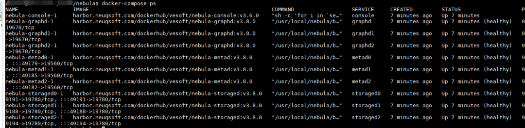 mkdir -p /work/nebula#复制docker-compose.yamlcp ../nebula-docker-compose-3.8.0/docker-compose.yaml /work/nebula/# 复制环境变量文件cp ../nebula-docker-compose-3.8.0/.env /work/nebula/# 修改.env,时区使用Asia/Shanghaivim .envTZ=Asia/Shanghai# 启动docker-compose up -d# 查看启动结果docker-compose ps是 git clone -b release-3.8 https://github.com/vesoft-inc/nebula-docker-compose.git