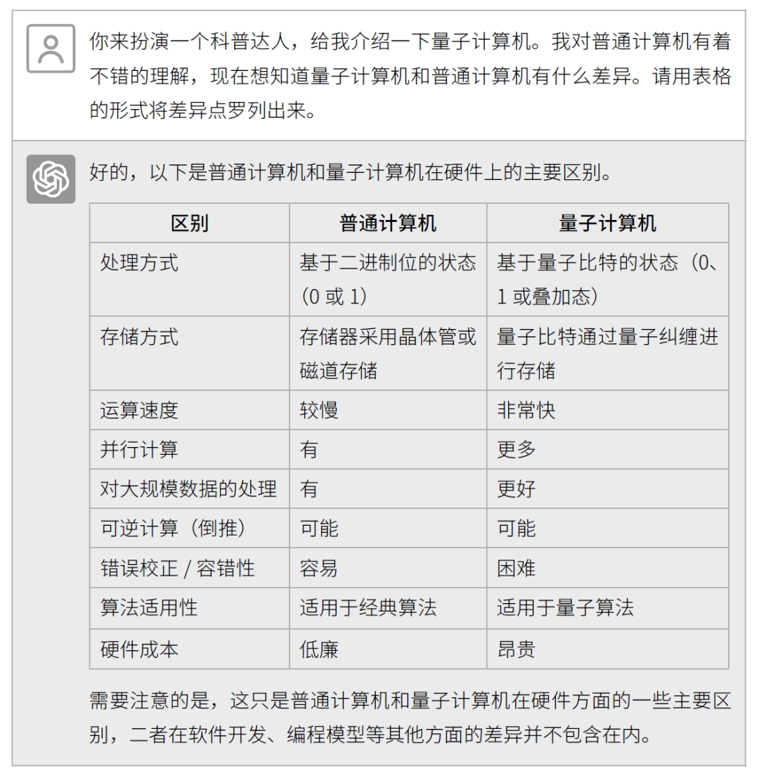 日常工作或者学习中,虽然人人都用 ChatGPT,但是不同的人使用 ChatGPT 的效果可谓千差万别。 有的人能运用它完成各种工作任务,有的人却只能通过它得到一些无关痛痒的内容,这其中关键的原因就是你还没有掌握提效的关键 —— ChatGPT 提示词。 想用好 ChatGPT,比如要适当给他一点“压力”。首先要定一个目标,之后给它下达一个明确的指令,最后根据 ChatGPT 生成的结果再进行调整。如果你觉得这些这些很抽象,那么请一定要牢牢记住这个公式,这样写出来的提示词又高效又好用。 提示词=定义角色+背景信息+任务目标+输出要求 下面我们来尝试一下,比如我在浏览信息的时候,看到有人在说量子计算机如何强大,对此我感到好奇,这时我就可以让 ChatGPT 帮我解释一下量子计算机的特点。下面是我向 ChatGPT 询问的过程。 在这里,按照提示词公式,我先给 ChatGPT 定义角色,因为我只是想做初步的了解,所以让它扮演了一个科普达人的角色。接下来,我要给它一些背景信息,我告诉 ChatGPT 我对普通计算机有着不错的理解,这就意味着不需要它给我解释得特别简单。我希望知道量子计算机和普通计算机究竟有什么差异,这是我的目标。最后是输出要求,我希望以表格的形式输出,因为表格的形式一目了然,非常便于抓住重点。