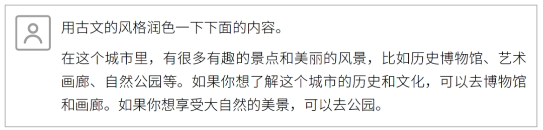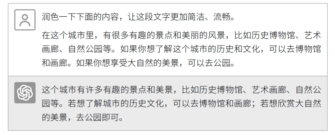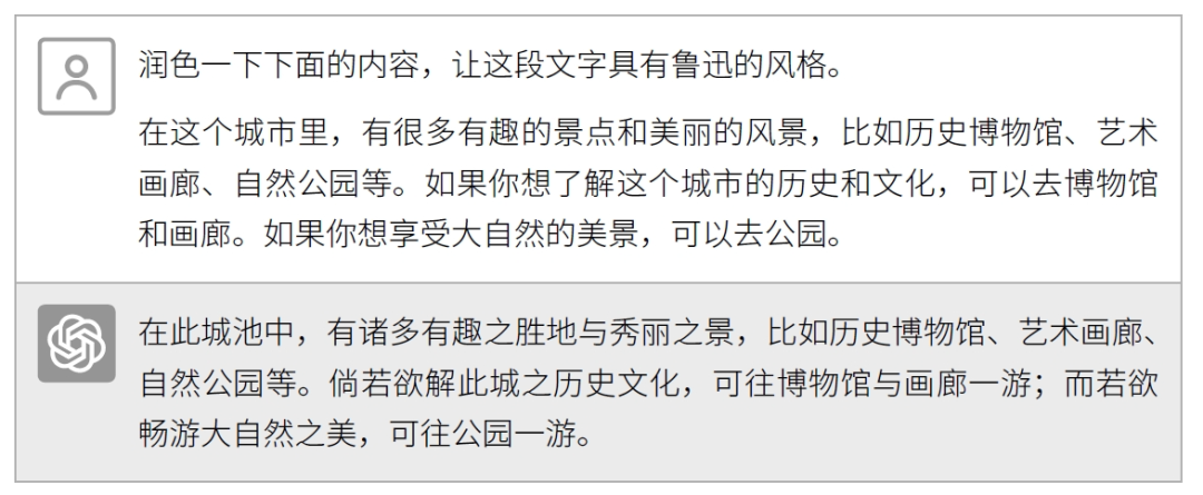 在进行文字创作时,通常情况下,我们会重点关注内容本身,文字表达则是次一级的关注点。所以,每当写完内容时,我们会再次回到内容本身,对文字进行润色。文字润色是一种优化和改进文本内容的过程,它可以使文本更加准确、清晰、流畅和易于理解。对写作、翻译、编辑等领域的专业人士乃至普通人来说,文字润色都是非常重要的,因为它可以提高文章的可读性,有助于吸引更多的读者并传达更准确的信息。 ChatGPT 也很擅长对文字进行润色。使用 ChatGPT 进行文字润色非常简单,只需将文本输入到 ChatGPT 中,提出你的要求即可,ChatGPT 将根据要求生成改进后的文本,帮助你完善和改进文本内容。此外,ChatGPT 还可以根据上下文信息提供更加恰当的单词和短语,以使文本更加简洁和精练。 例如,你在写一篇关于旅游的文章,你想让 ChatGPT 帮忙润色一下,以使该文章更简洁一些。 通过 ChatGPT 进行文字润色后,整个文本变得更加准确、流畅和简洁,更能吸引读者的眼球,让人更容易理解和接受文本中的信息。 当然,我们也可以让文字具有一些风格。仍以刚才那段文字为例,我们想让这段文字具有鲁迅的风格。 我们甚至可以让 ChatGPT 用古文的风格进行润色,这里还是以刚才那段文字为例。 由此可见,ChatGPT 熟悉的风格还是很多的,所以,使用 ChatGPT 进行文字润色非常有意义,它不仅可以帮助人们优化和改进文本内容,还可以提高文章的可读性和影响力。再也不用担心甲方需求变来变去了。 不管你是程序员,翻译从业者、数据分析师、还是设计师,生活工作都离不开这些 AI 助理。 那么各个领域的职场人如何用好 ChatGPT 等 AI 工具的各项“隐藏”功能,让它更好地服务于人,这本《AI助理:用ChatGPT轻松搞定工作》不得不读,它聚焦职场工作效率全面提升,覆盖作图、视频生成、编程、提示词撰写、文案创作、智能体设计等多个场景的需求,帮职场人用大模型的力量重塑工作流程。