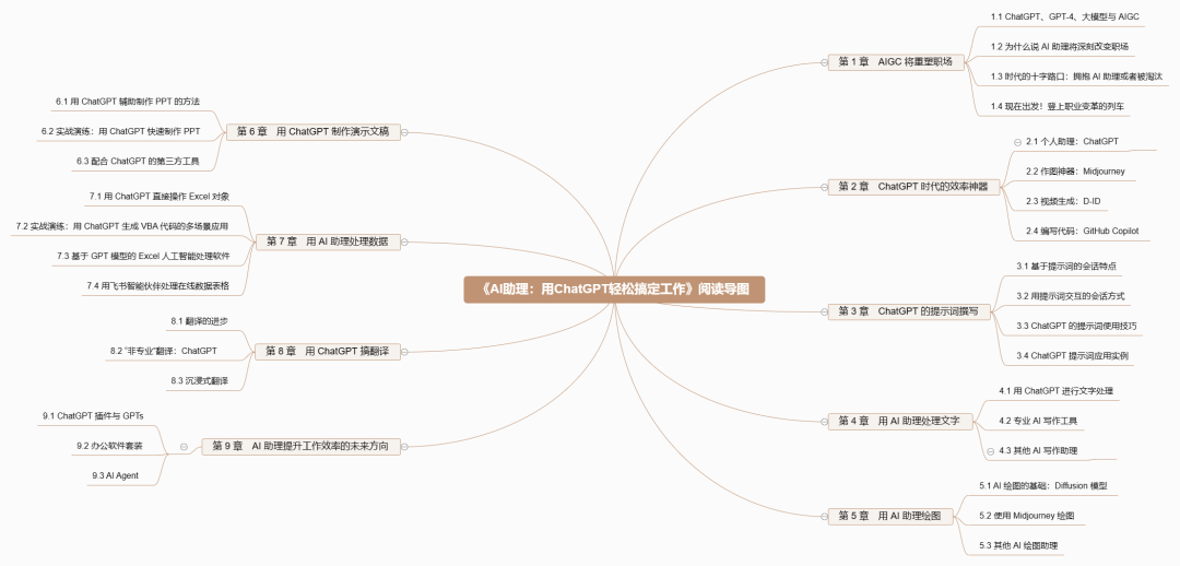 第 9 章则着眼于未来,探讨了 AI 助理如何继续促进工作效率的提升,并对 ChatGPT 及相关 AI 助理工具的潜在发展方向进行了展望。