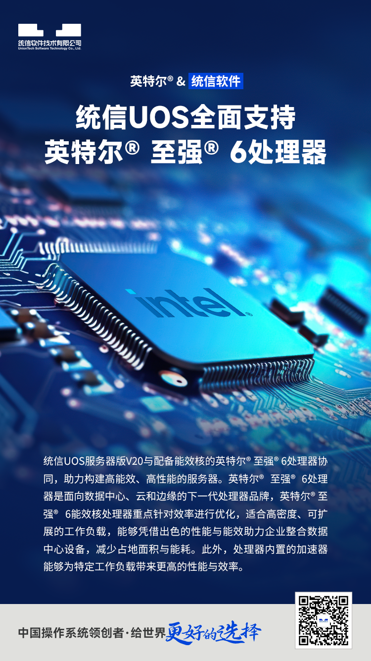 英特尔® 至强® 6能效核处理器在能效上的卓越提升有助于客户缓解能耗焦虑,构建更加节能的绿色数据中心,通过与英特尔® 至强® 6能效核处理器进行融合,统信UOS服务器版V20得以进一步拓展在性能、能效等方面的优势,为行业数字化转型提供强有力的支持。未来,统信软件将继续引领服务器操作系统市场的发展潮流,为企业创造更大的价值。