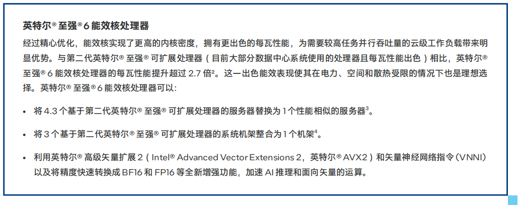 结合系统层面的 VFS 页缓存优化、调度延迟优化、锁并发优化等技术,以及配备能效核的英特尔® 至强® 6处理器强大的硬件能力,可为多元负载提供强大的算力;