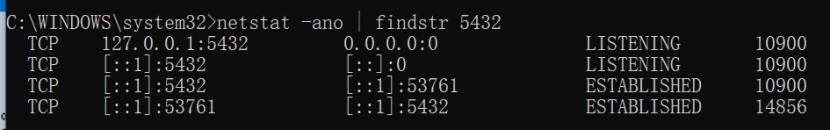 通过netstat命令可以看到客户端随机分配了端口53761。服务端10900为postgres主进程,他绑定在5432端口上: