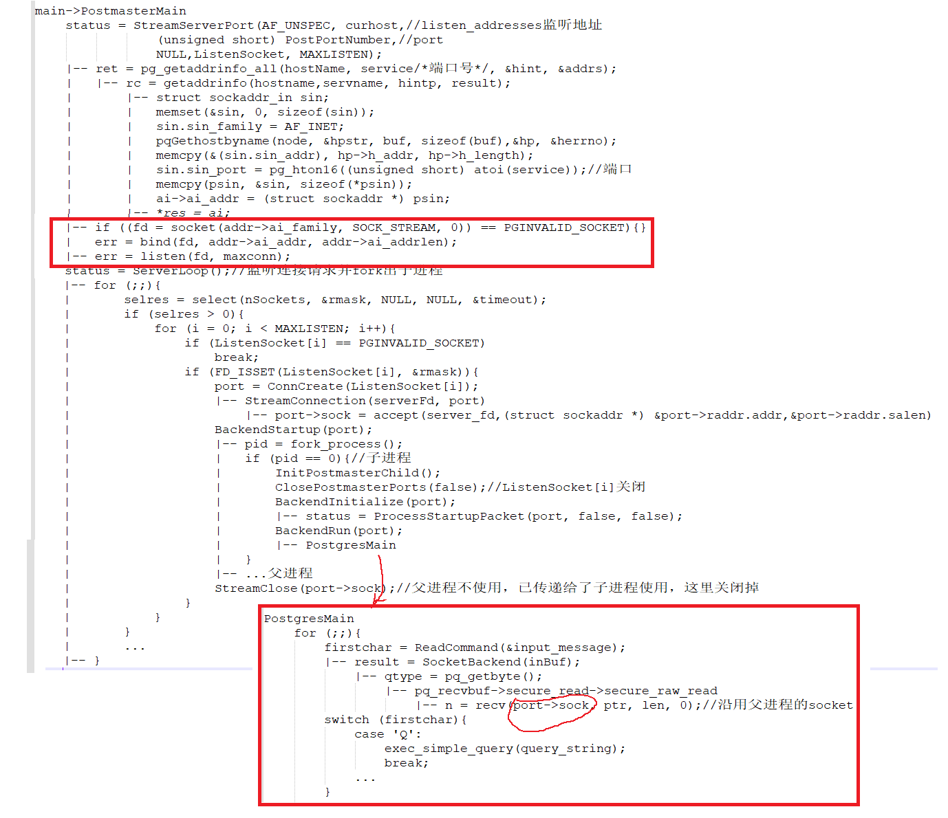 1)Postgres进程启动的时候就会绑定配置项port设置的端口,由函数StreamServerPort函数完成。上图所示,StreamServerPort完成socket、bind、listen的操作。