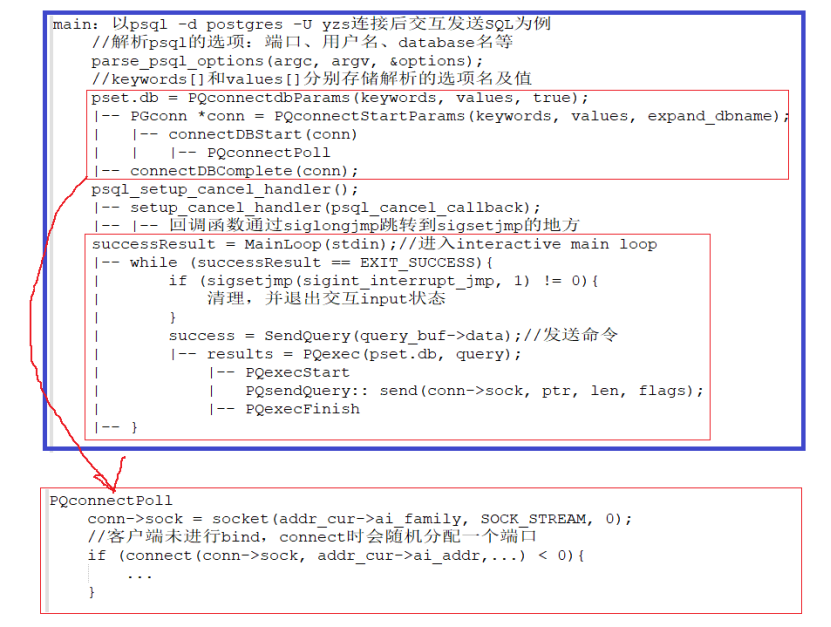 3)连接成功后,后面在MainLoop函数中接收psql端的输入,接收到命令后通过SendQuery函数将其在上面的套接字上将其发送给服务端。