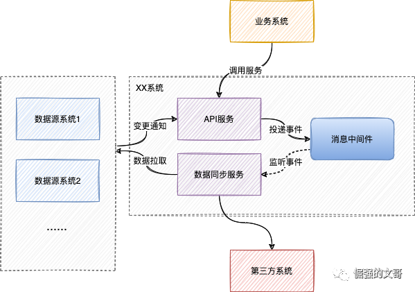 数据来源于内部的多个业务系统,API服务会接收这些业务系统的数据变更通知,将通知事件投递给消息中间件,数据同步服务监听事件并同步给第三方系统。