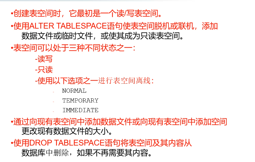 tempory:即使表空間中的一個或多個文件出現錯誤,也可以暫時使表空間脫機。oracle數據庫將數據文件脫機時,并在脱机时对其执行检查点。如果没有文件处于脱机状态,但使用了临时子句,则无需进行介质恢复。但是,如果表空间的一个或多个文件由于写入错误而脱机,并且已经暂时使表空间脱机,则需要恢复表空间,然后才能使其重新联机。