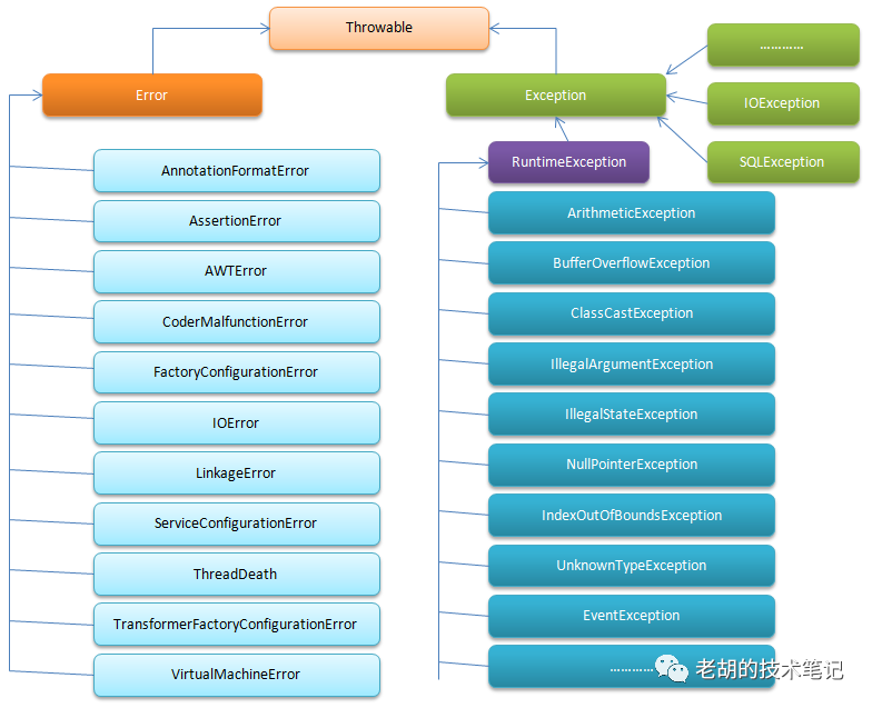 首先,java的异常分为Error和Exception。这两类都是接口Throwable的子类。Error及Exception及其子类之间的关系,大致可以用下图简述: