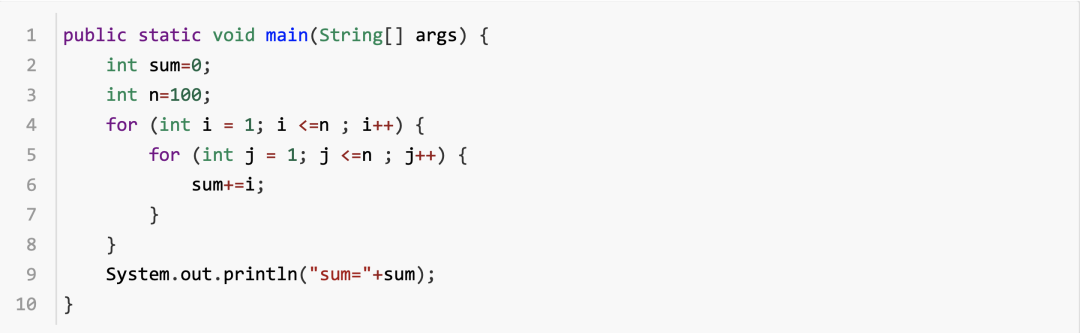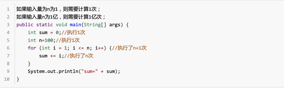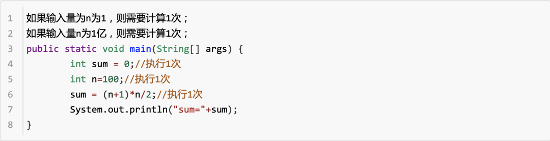 从图3来说,我们可以通过数学的方式计算出,总执行次数为O(1+1+n+(n+1)*n/2+(n+1)*n/2)=O(n²+2n+2)。
