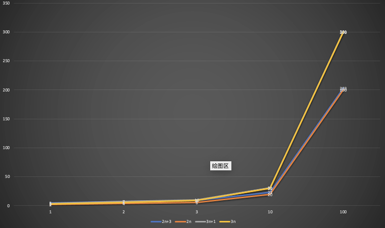 从上面两张图我们可以看出,同样是求相同数据规模的和,随着数据规模n的增加,第一个算法比第二个算法的执行次数大大增加,相应的第一个算法比第二个算法的时间复杂度也是大大增加的。所以上图中,图一的总执行次数是O(2n+3),图二的总执行次数是O(3)。